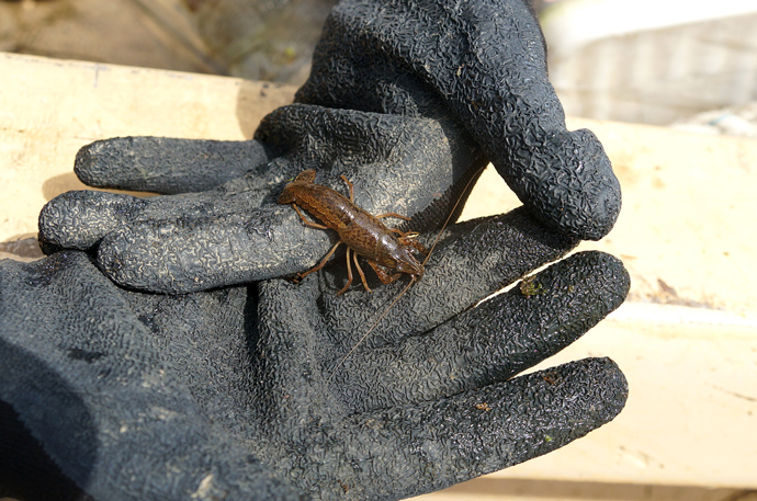 そんな中、こんな生き物に出会えました。 とても元気なザリガニです。ゴミを拾う際に一緒についてきたようです。沢に生き物がいることに清掃活動中は全く気づきませんでした。