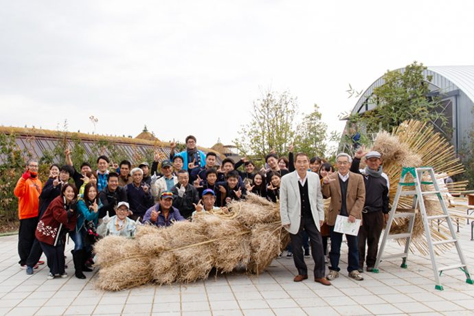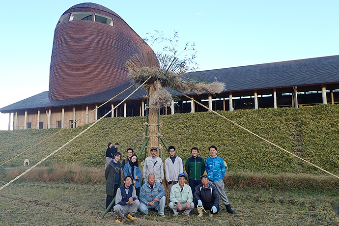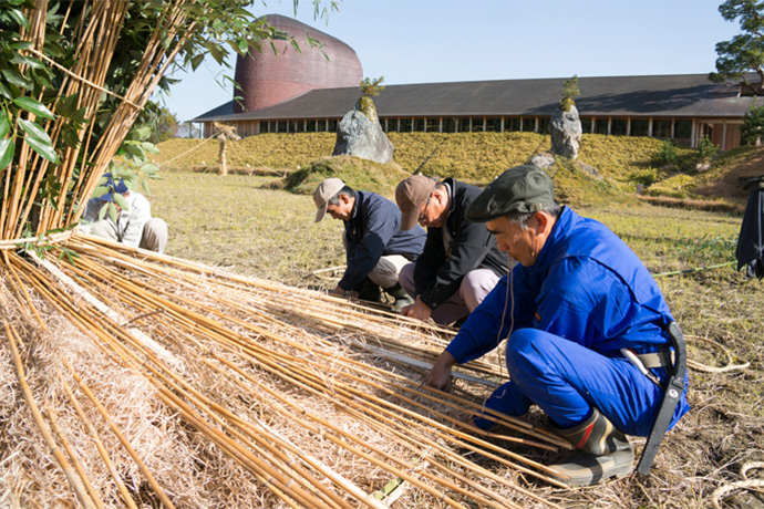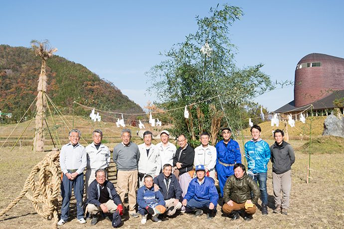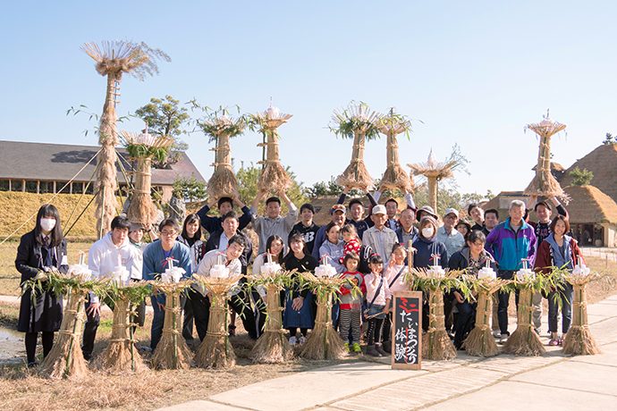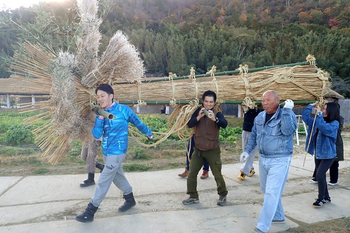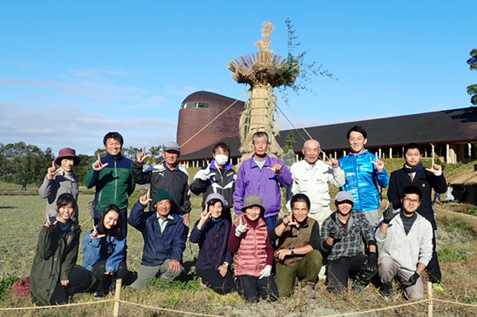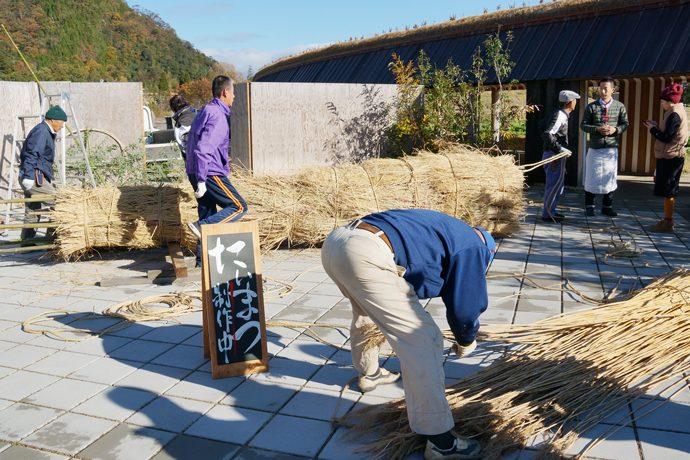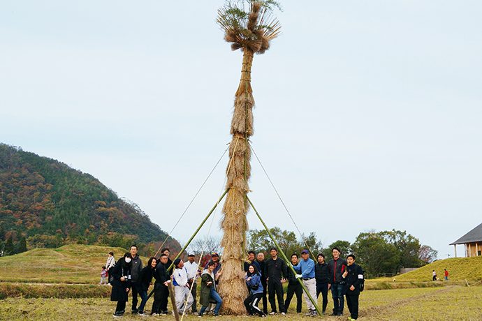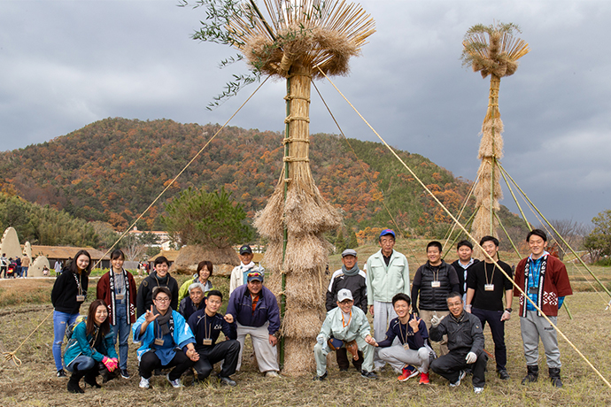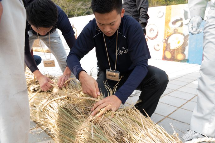 12月1日には長田町「盃松明」をお客様の前で制作・設置を披露するデモンストレーションを行いました。 制作には近江兄弟社高等学校の学生達と「文化遺産として松明を次世代へ贈る会」のみなさんが協力して1基の松明を作り上げます。 初めて松明制作に参加する学生たちは、松明作りに重要な「かしわ結び」「男結び」を何度も教えてもらい真剣に取り組んでいました。