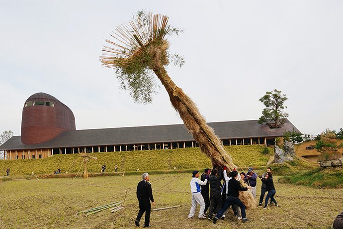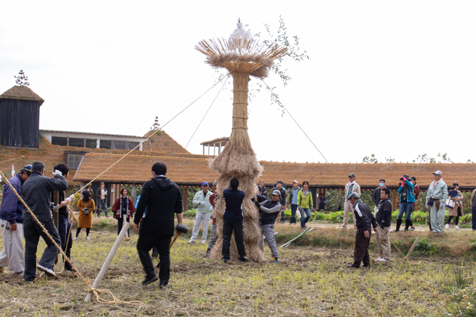 近江八幡市では毎年3月から5月にかけて、市内各集落あわせて200基の松明(たいまつ)が結われ、奉火(ほうか)されます。ヨシや菜種ガラを材料に様々な形に結われる松明は地域ごとのお祭りとともに1000年以上も受け継がれてきたものです。 この伝統文化を多くの方に知っていただきたいと、地元団体や各地域の人々の協力を得て、2016年からラ コリーナ近江八幡でたいまつフェスを開催してきました。 今年も、北之庄町、島町、白王(しらおう)町、千僧供(せんぞく)町、長田(おさだ)町の松明が展示されました。