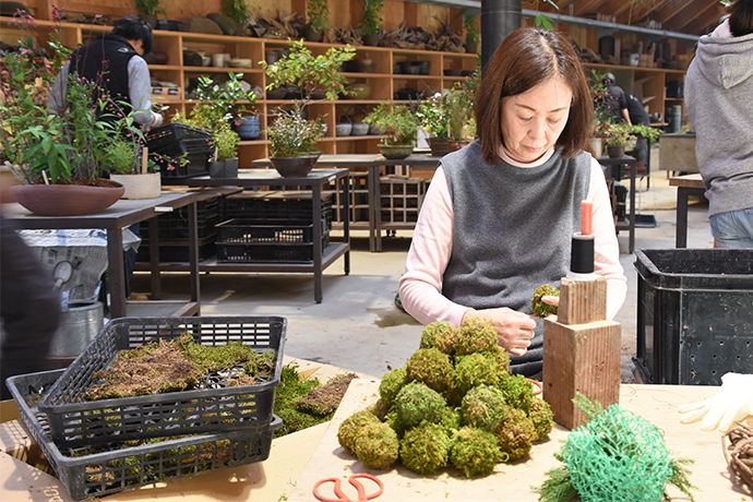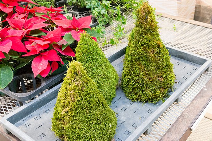 苔(こけ)玉や葉っぱのツリー、椿の殻を使ったゆらゆら揺れる様子が可愛らしいツリー・・・