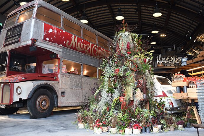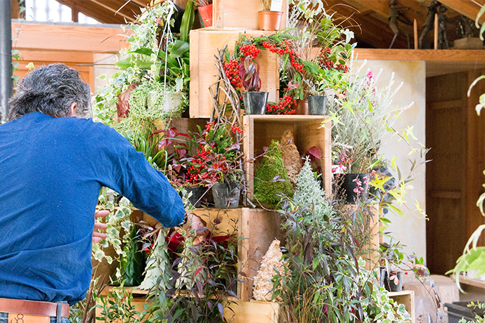 ラ コリーナでは、木箱をつみきのように積み上げ、山野草や観葉植物などで装飾したクリスマスツリーをギフトショップの店内外で展示中です。