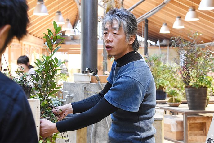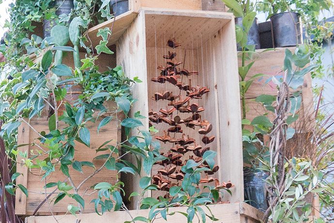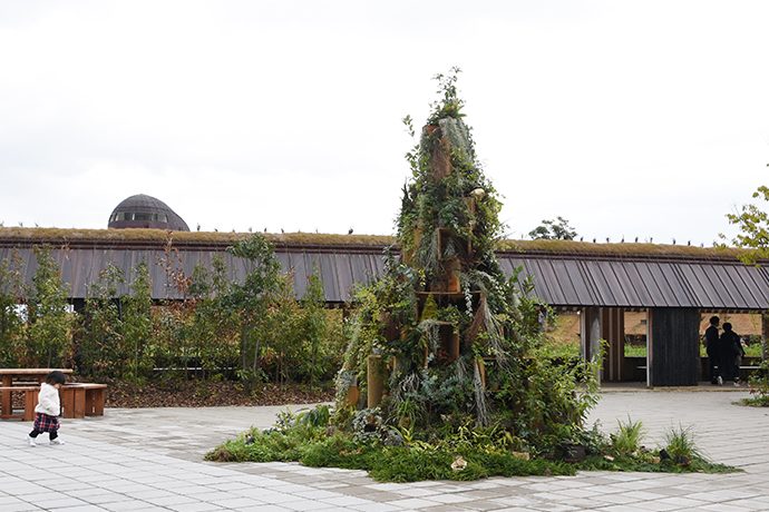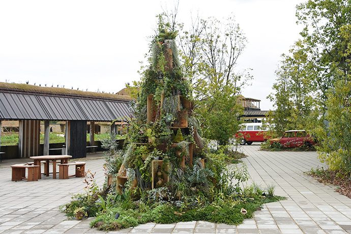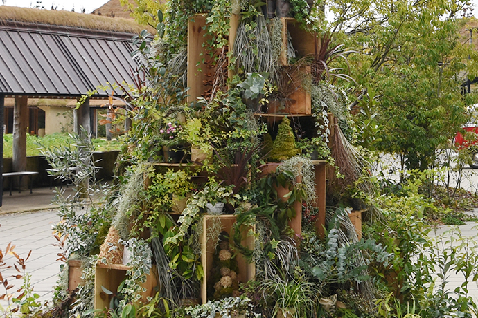 ラ コリーナのランドスケープでお世話になっている重野国彦さんのデザイン案をもとに、たねや農藝のスタッフで製作。全体がツタで覆われていますが、じっとご覧いただくと、木箱の小部屋に小さなツリーがたくさんあるのがおわかりいただけると思います。