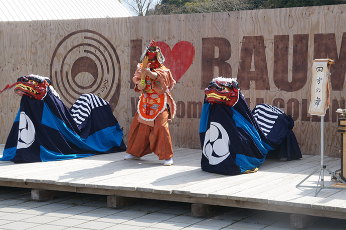 厳かにはじまったのは「四方の舞」。2頭の獅子とササラを持った猿田彦が場を祓い清める舞です。 「四方の舞」