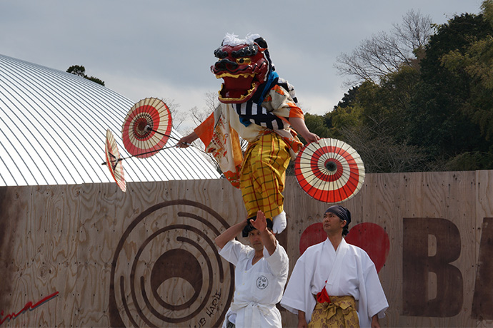 3月24日(日)フードガレージステージで伊勢大神楽が舞いました。 昨年につづき伊勢大神楽講社の山本源大夫(げんだいゆう)さんの一行です。 つめたい風が吹くあいにくのお天気でしたが、笛や太鼓のお囃子(はやし)に誘われ、ステージ前にはたくさんのお客さまがいらっしゃいました。