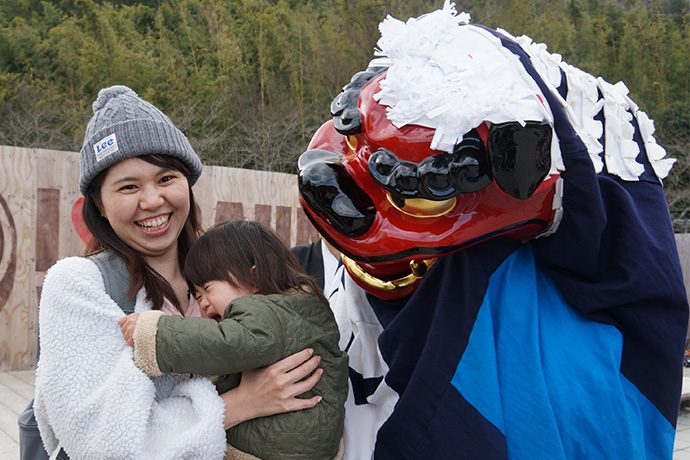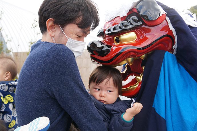 演目のあとは、無病息災や子どもの健やかな成長を願い、獅子に頭を噛んでもらいます。これは獅子舞とともに伝わる昔ながらの風習。目の前に迫った獅子に泣いてしまう子、恥ずかしくなる子など反応は様々でした。