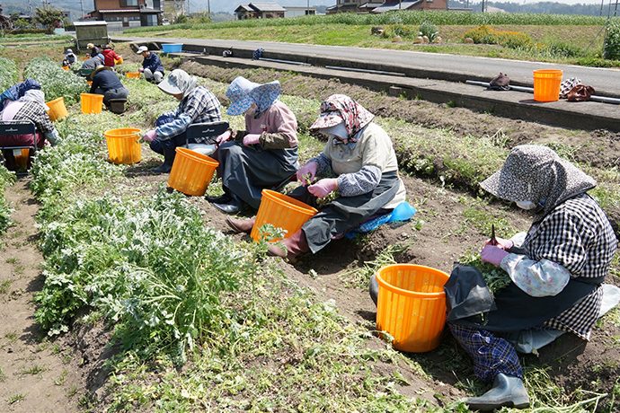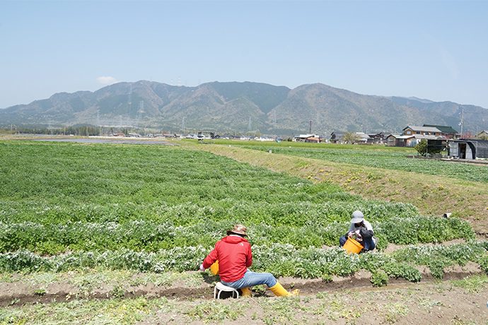 4月下旬、鈴鹿山系をのぞむたねや永源寺農園で今年もヨモギ摘みが始まりました。ヒバリのさえずる畑では、農園スタッフが一つひとつ葉の具合をたしかめ、手作業で摘みとっていきます。