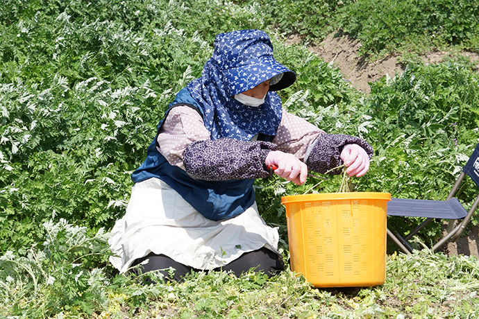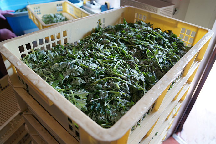毎年春から夏にかけて摘むヨモギは畑近くの加工場で選別後、茹でてペーストにしたものを保存します。収穫から日を置かず加工することで、瑞々しい香りと色を活かした素材としてたねやのお菓子などに使われています。