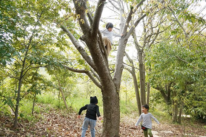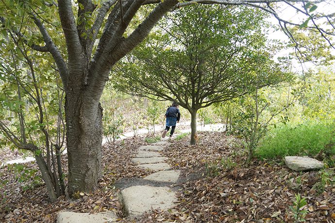 Boscoの広場から伸びる小道はメインショップへつながるほか、いくつかは林の中へと続いています。踏み石の間隔が狭く大人には少し歩きにくいこの道は、じつは子どものためのもの。林の中を探検したり走り回ったり、自由に楽しんでほしいという願いから作られました。