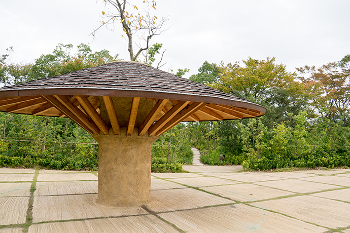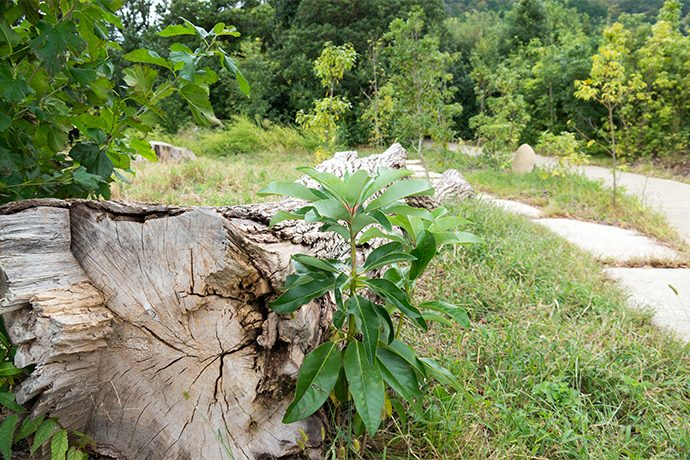 また、あちこちに据えた丸太や切り株はラ コリーナ内の工事で出たものを活かし、敷き詰めた落ち葉は森の雰囲気をかもし出すとともに、土を育て、木の成長も助けています。