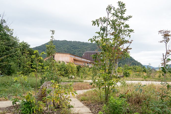 ゆるい坂を登った先にみえるのはたねやグループの森づくりのシンボル「Bosco(ボスコ)」。イタリア語で森や林を意味するこの場所は、土づくりと植樹をへて、2019年に行われた「鎮守の森のプロジェクト」でお披露目されました。