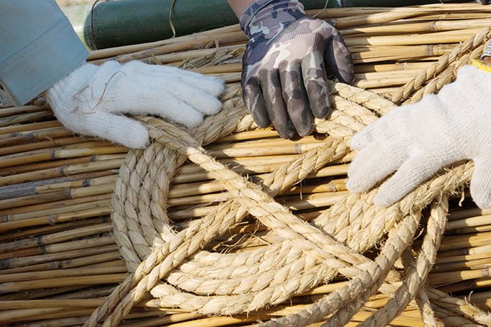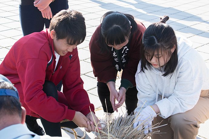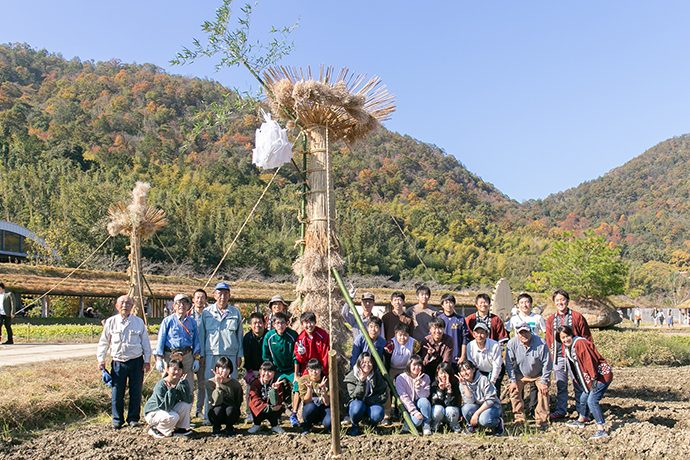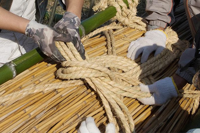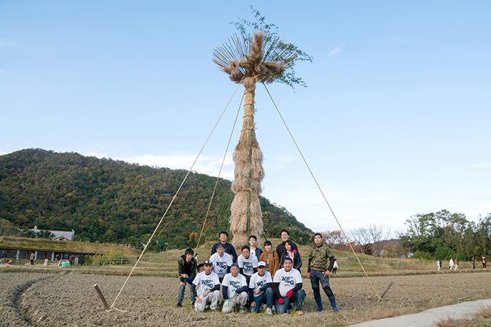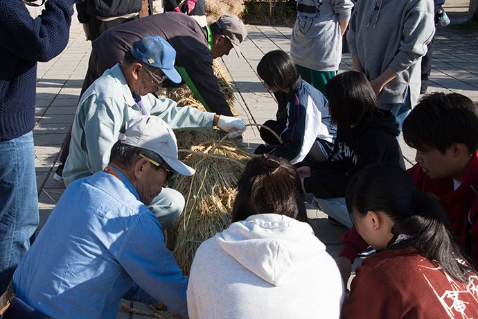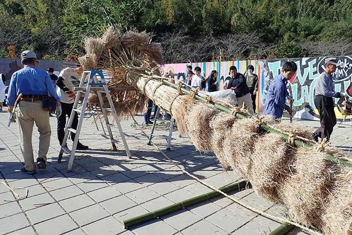 23日、晴天の下地元の方と、学生達が一緒に大きなひとつの “たいまつ” を結いあげました。 ヨシと菜種ガラを束ね、縄でしっかり結んでいく。素材の扱い方や緩まない縄の結び方など、形作られていくたいまつのあちこちで、教え教わる姿も見られました。 このたいまつ作りには、伝統に触れる以外にも大事なことが含まれています。