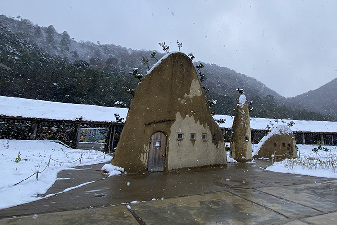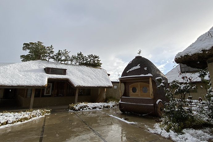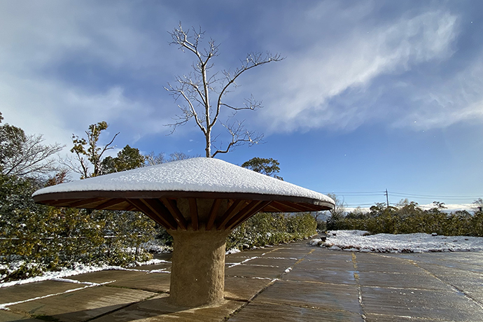 雪が降ったラ コリーナの敷地内を散策すると、さまざまな表情がいたるところにみられます。 特設販売所「銅仮面」は何だか寒そうな表情に