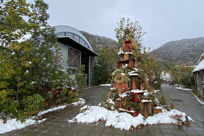 メインショップをぬけると、先日完成したクリスマスツリーにも少しだけ雪が積もっていました。