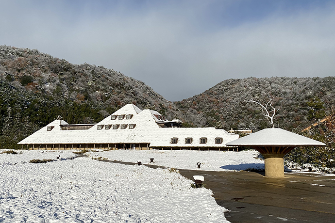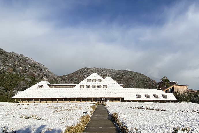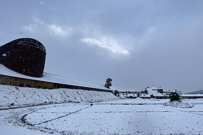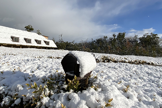 昨年は雪が降らなかったので久しぶりの雪景色です。 昨夜から降った雪でほんのり白く雪化粧した八幡山と白い草屋根が美しく、 出社した従業員も足を止め、スマホを取り出して写真を撮っている姿が見られました。