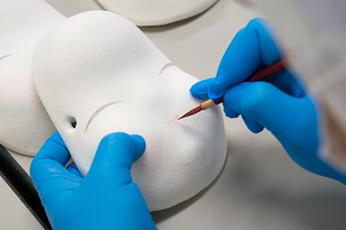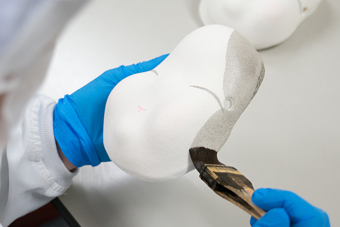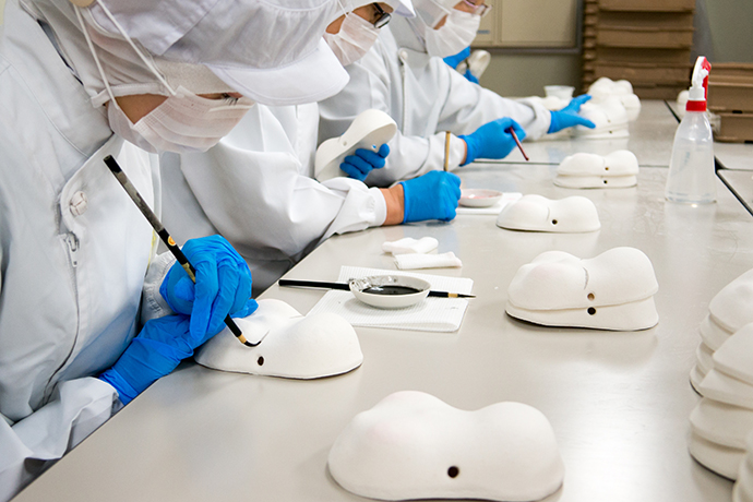 ■お多福さんの顔を描くためにみなさんどんな練習をされますか?また新人さんでも描けるものなんでしょうか。 製造のロス(廃棄)になったお面で何度でも練習します。面描きの技術習得までは約3年。 人によりますが新人さんでも1年で一部は描けるようになります。