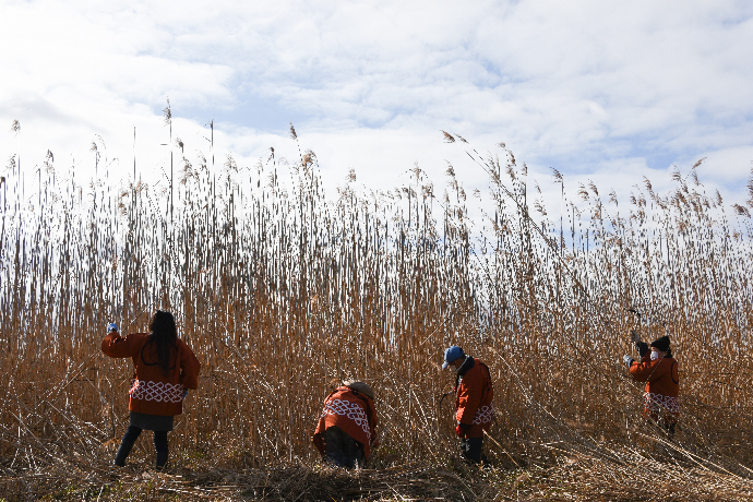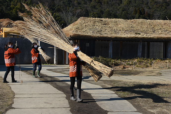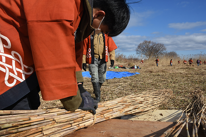刈り取ったヨシを藁網で束ね、円すい状に仕立て、ヨシを乾燥させます。 視覚的にもこだわった伝統的な「丸立て」。これをスタッフが仕上げていきます。