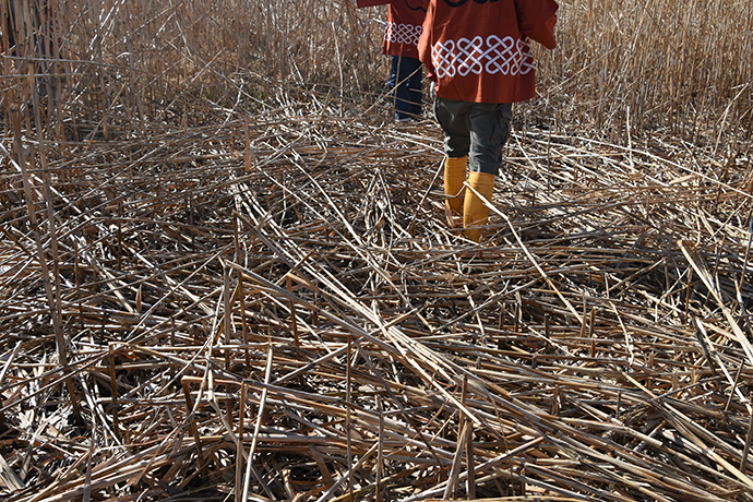 ヨシの切り口が刺さらないよう注意しながら、穂のあるヨシは刈り取り、穂のないヨシは足で踏み倒していきます。
