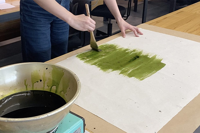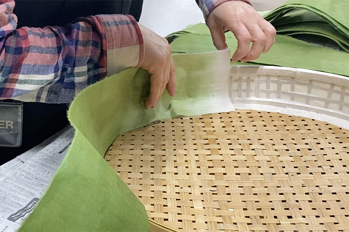次に、色づけした和紙を貼っていきます。 今回製作しているざるは春の展示で使用するので、新緑をイメージした色を和紙に染めていきます。
