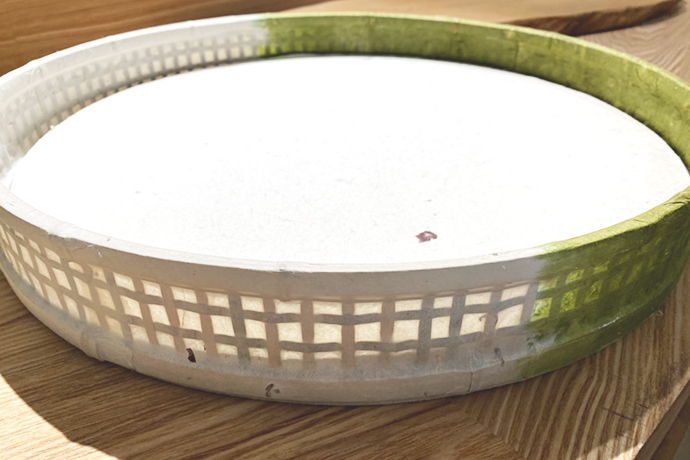 ざるに合うように和紙をカットし、和紙を貼っていきます。