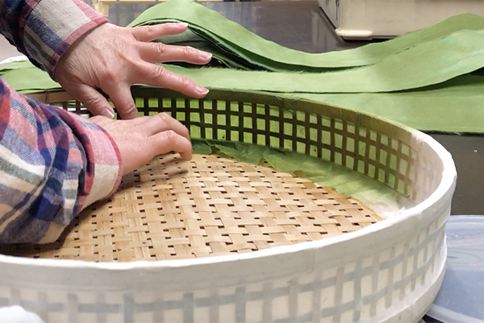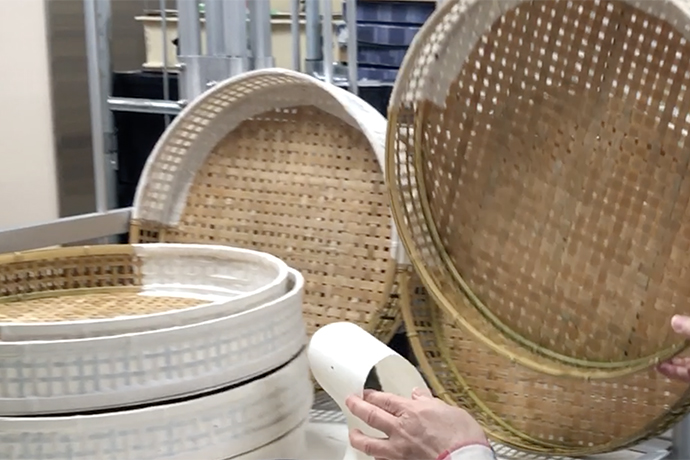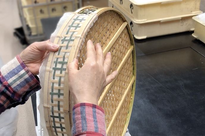 今回は展示用備品として使われる「ざる」の製作過程をご紹介いたします。