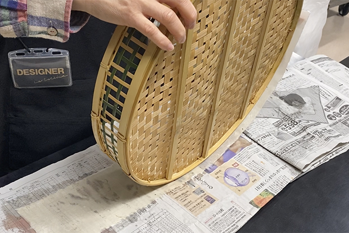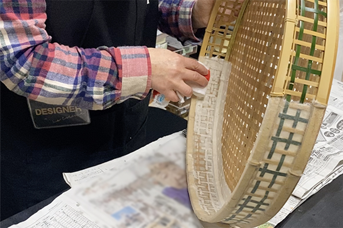 展示を終え、ざるが店舗から返ってくれば劣化していたり、和紙の剥がれがないかを確認し次に使う時まで大切に保管します。