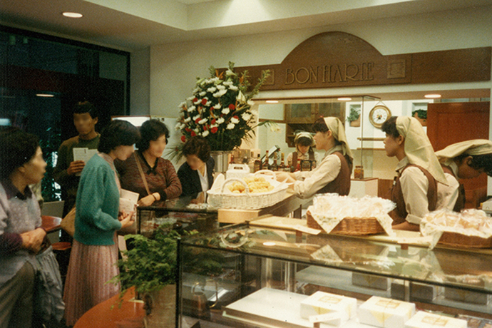 1979年にはたねやの洋菓子部門から独立し、株式会社「BON HARIE(ボンハリエ)」を設立。その後、人があつまる社交場(クラブ)のようにとの願いをこめ1995年に商号を変更。株式会社「CLUBHARIE(クラブハリエ)」を設立しました。 <1983年頃のクラブハリエ前身BON HARIE(ボンハリエ)店内>