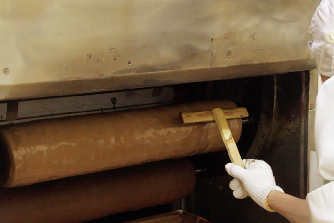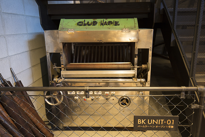 洋菓子部門で本格的なバームクーヘンの製造がはじまったのは1973年。専用の機械で職人が一本一本焼きあげるやわらかな食感は、当時から地元の方々に親しまれたそうです。 <バームクーヘンオーブン1号機>