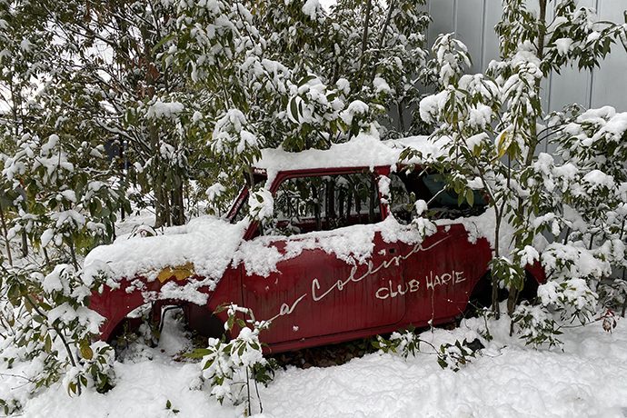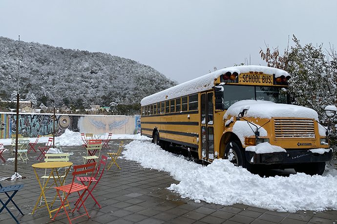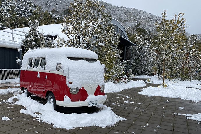 ワーゲンバスやスクールバスにも雪が積もっています。