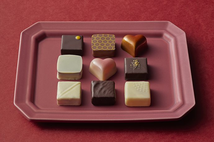 そして、今年新たな取り組みとしてチャレンジした「フルーツジャポネ」にも注目です。 柿・栗・日向夏(ひゅうがなつ)など和菓子でよく使う果物を素材に、チョコレートを合わせた新感覚のボンボンショコラとなっています。和菓子の素材はチョコレートと水分や油分の量が異なるため、ただ組み合わせるだけではガナッシュのようになめらかな口どけにはなりません。何度も試作を繰り返すうちにたどり着いたのが、口どけよく、チョコレートとも相性の良い羊羹でした。果物の味わいを最大限に活かした今までにない「和菓子×ショコラ」をこの機会にぜひお楽しみください。