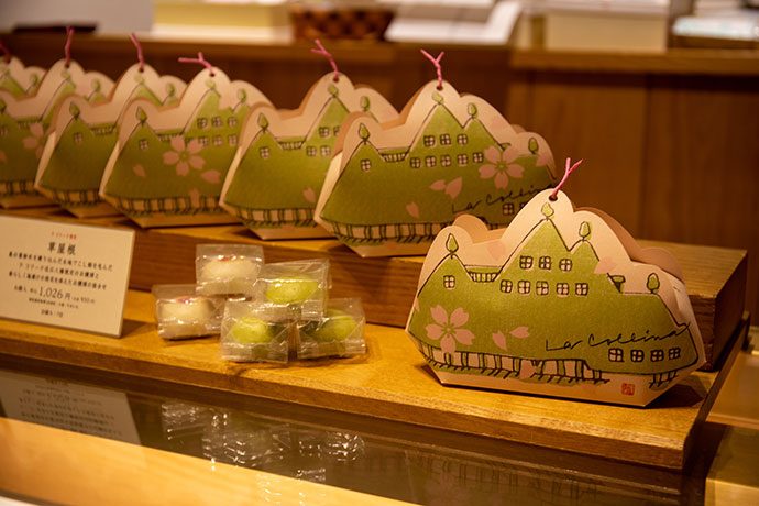 メインショップの和菓子売り場では、季節のお饅頭を入れた「草屋根」をご用意しております。桜の舞う限定パッケージは4月上旬までですので、お早めに。