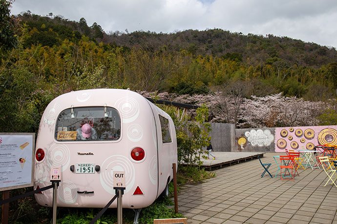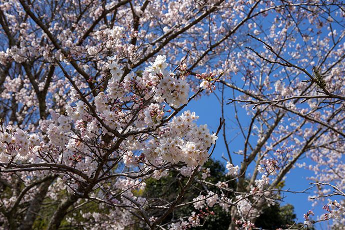 次に、桜のご紹介。 回廊を抜けたフードガレージ側では、八幡山のふもとの桜並木も見ることができます。