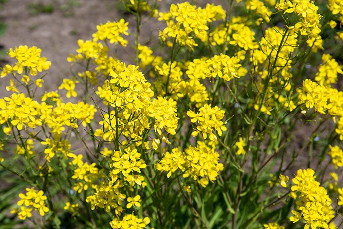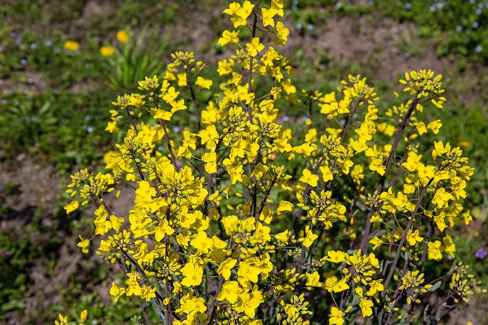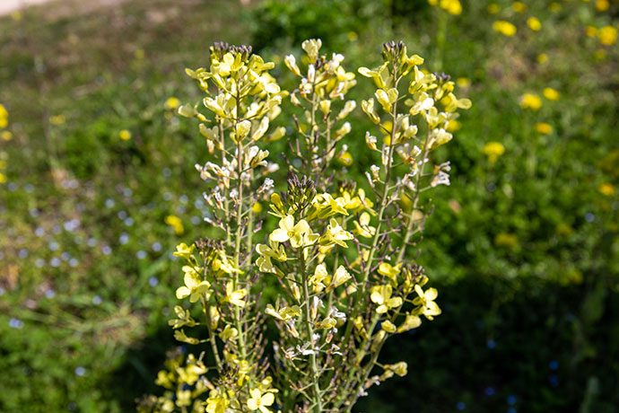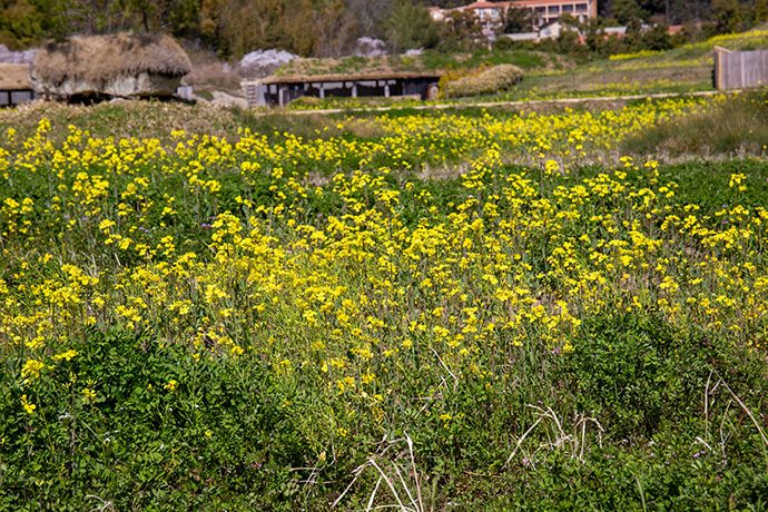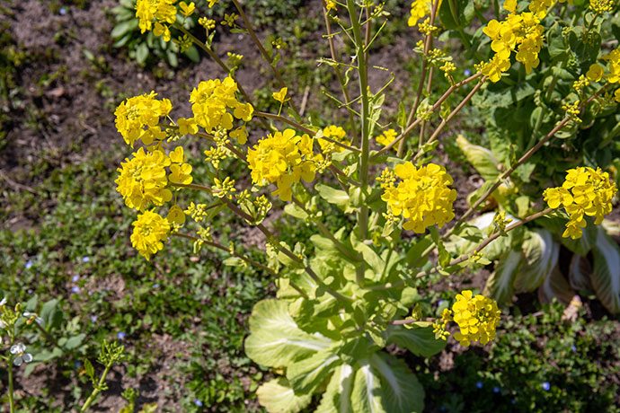菜の花だと思い込んでいたこの花は、実は野菜の花だと教えてくれたキャンディーファームのスタッフ。 白菜、壬生菜(みぶな)、のらぼう菜、北之庄菜など、聞けば数種類もあるようで、よく見ると花の形、葉の形も違うそう。
