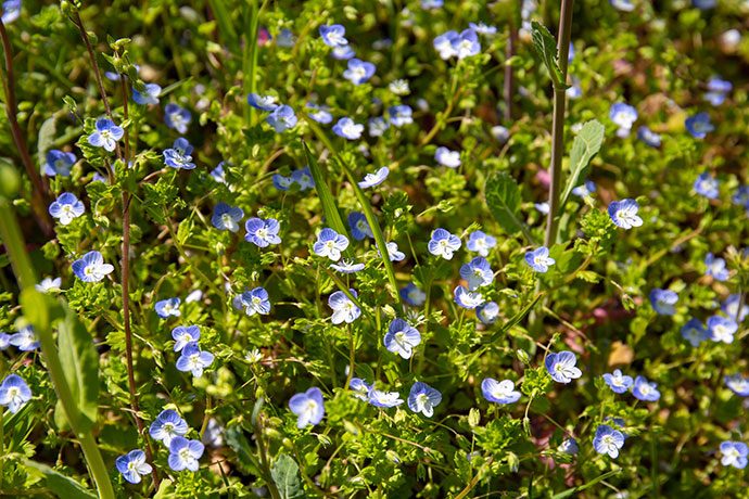 少し目線を落とすと、青く小さな「オオイヌノフグリ」が。 昼間になり気温が上がると、花びらがパッと開くそうです。