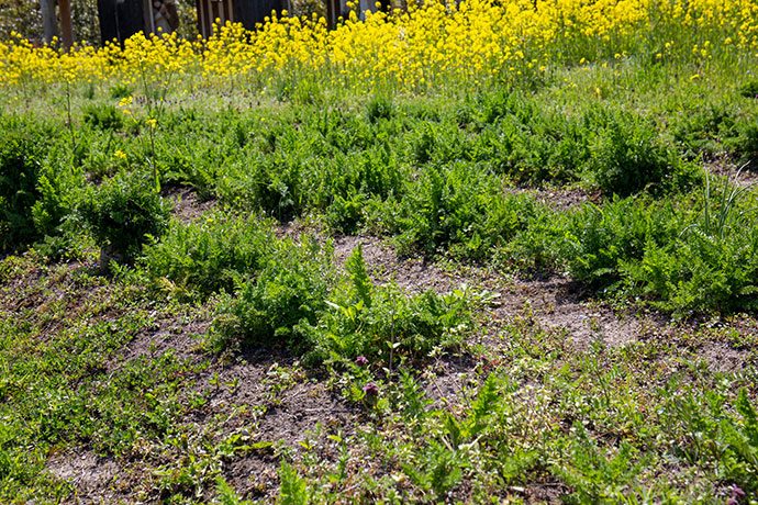 写真を撮っていると、「これ、にんじんやわ!」と畑を指さす女性のお客さま。 声のする方を見て探してみましたが、わたしはまだ葉っぱを見ただけではにんじんがどれかわかりません。 普段目にするにんじんは、スーパーの野菜コーナーに並ぶオレンジの根の部分なので、ふさふさした葉を見て、「これもにんじんか!」と新たな発見でした。
