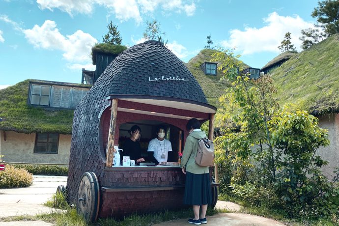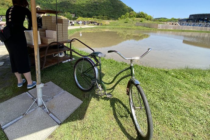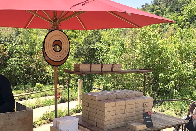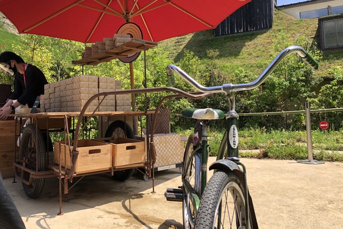 特設売り場の一つはなんとリヤカー!ラ コリーナ近江八幡の景観に溶け込むように、実際に使用していたリヤカーを引き取り、特設売り場の什器として活用しています。
