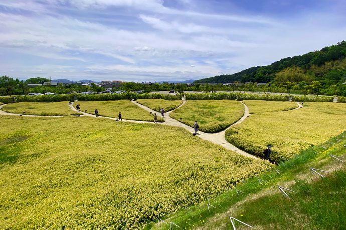 ラ コリーナ近江八幡の駐車場からメインショップのアプローチ部分には“おかめ笹(ささ)”を植えています。