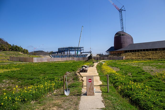 「(仮称)バームファクトリー」オープンに向け、ラ コリーナ近江八幡内の園路拡張工事を始めて約3ヶ月。試作期間を含めれば、約1年が経ちます。春ごろから田んぼを囲む道で、キャンディーファームのスタッフが毎日作業を続けています。