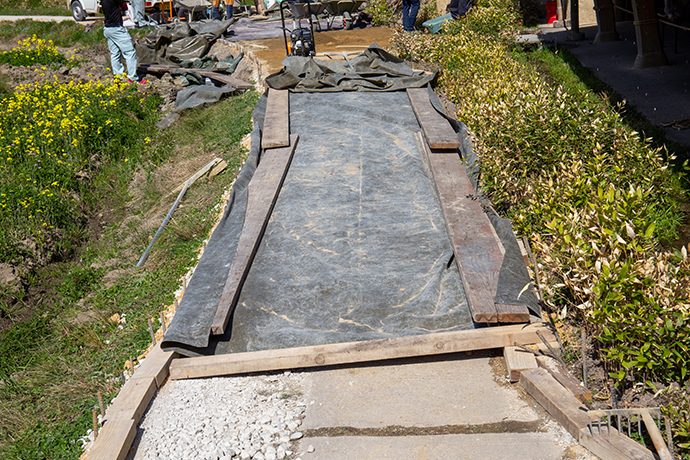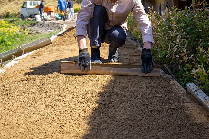 目指すのは、変化をお楽しみいただく道。歩くたびに少しずつ削れ、表情ができ、自然に変化していく。さらに時間をかけてヒビや割れができ、そこに土が入って草や苔が生えていく。そんな自然な変化をお楽しみいただけるような道を作っています。