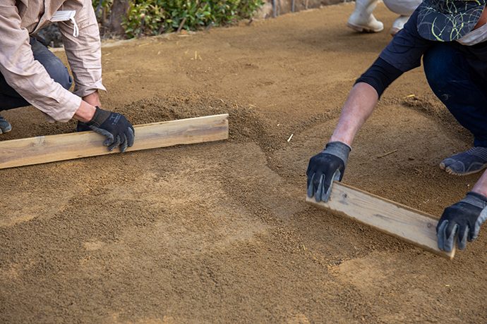 土台となる1層目。 下地は強度を重視し、材料は普通セメントと真砂土の2種類を使用しています。 生地の水分が飛ばないよう地面に水撒きをしてから、型枠に入れ、表面を整えます。