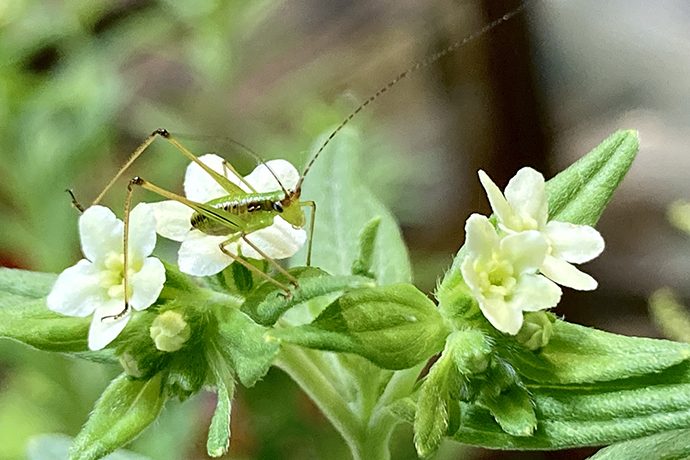 てっぺんがお気に入りのこの子は、”ヤブキリ”というバッタの赤ちゃんでした。樹の上で生活するバッタだそうで、高いところが好きなのも納得です。ピクピク動く長〜い触覚は、夜にたくさん動くのに役立つそうです。体より長い!