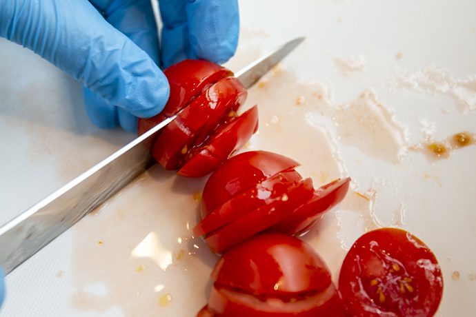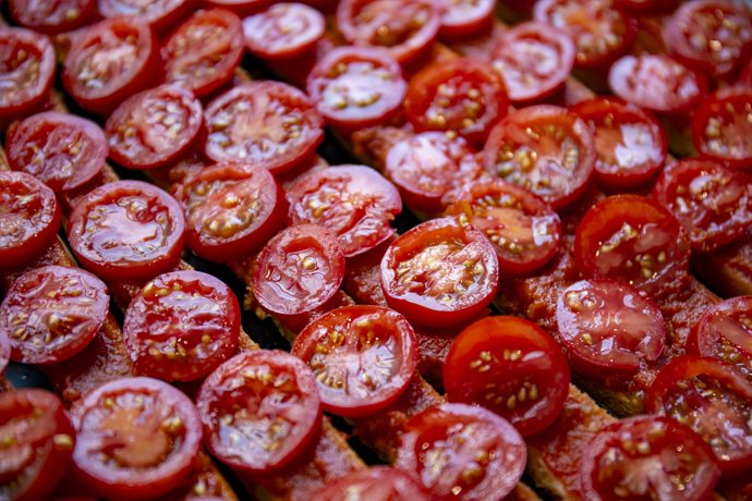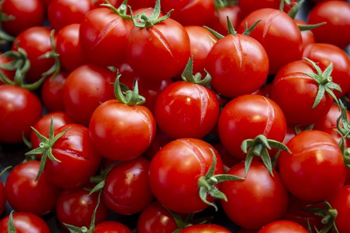 週末限定で使っている規格外のトマトは大きさはバラバラ、皮が割れていても濃厚な味わいは変わりません。