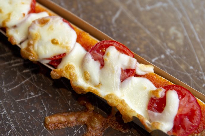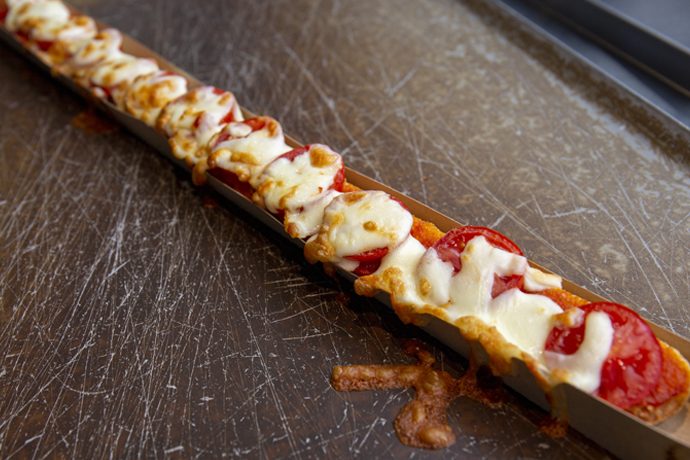 ラ コリーナ近江八幡 フードコート バゲットで販売している「ピザトースト」。 6月からフードロスの取り組みの一環として、割れトマトなどの規格外トマトを使用しています。
