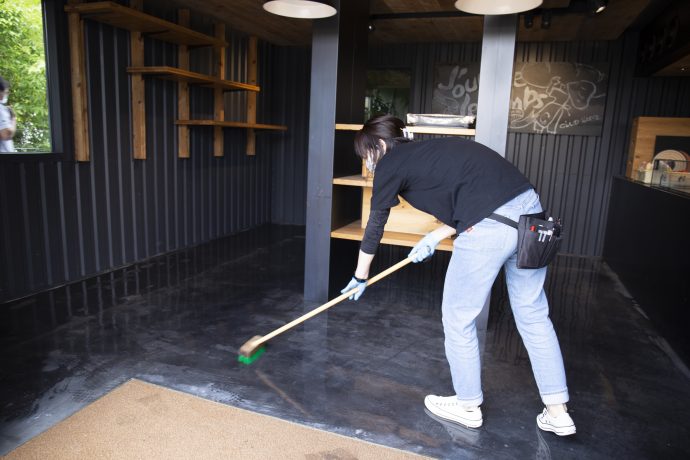 移転して約2年。まだまだ安心はできませんが、少しづつ日常に戻していくためオープン当時の場所へお店を戻すことになりました。まずは再開にむけてパンショップ内の掃除を行います。