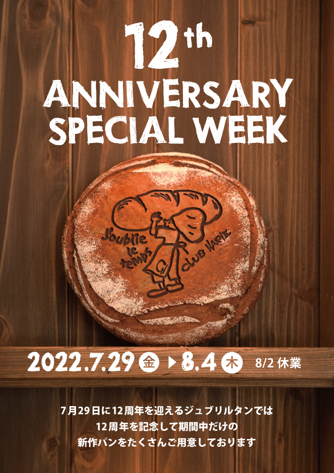 7月29日に12周年を迎えるジュブリルタンでは12周年を記念して7/29〜8/4までの期間限定でスタッフが考案した新作パンをたくさんご用意しています。