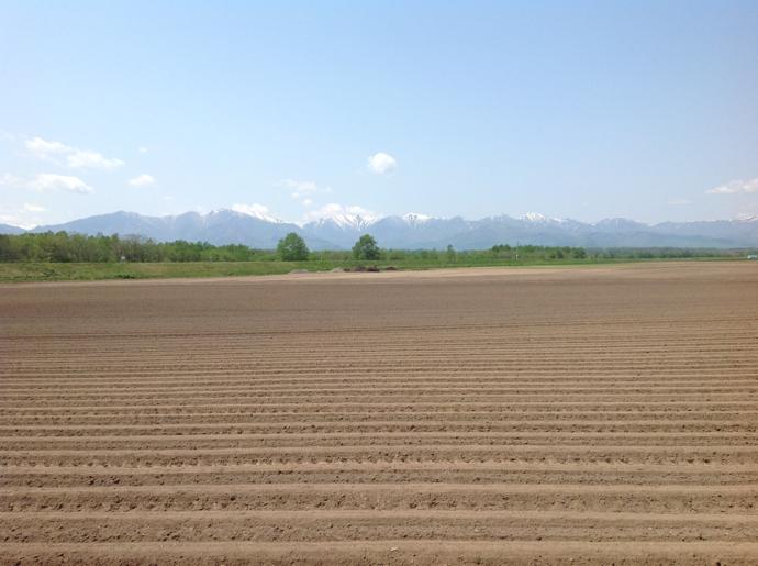畑の向こう、遠くには日高山脈が見えます。まだ少し雪が残っています。