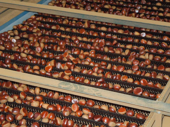 磨かれた栗を大きさ別に選別します。