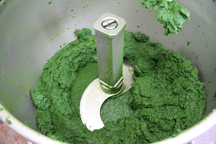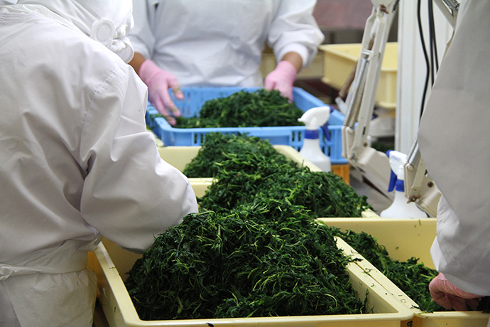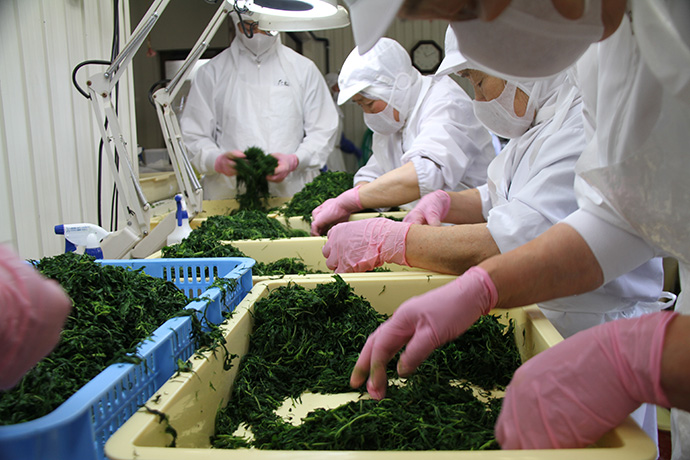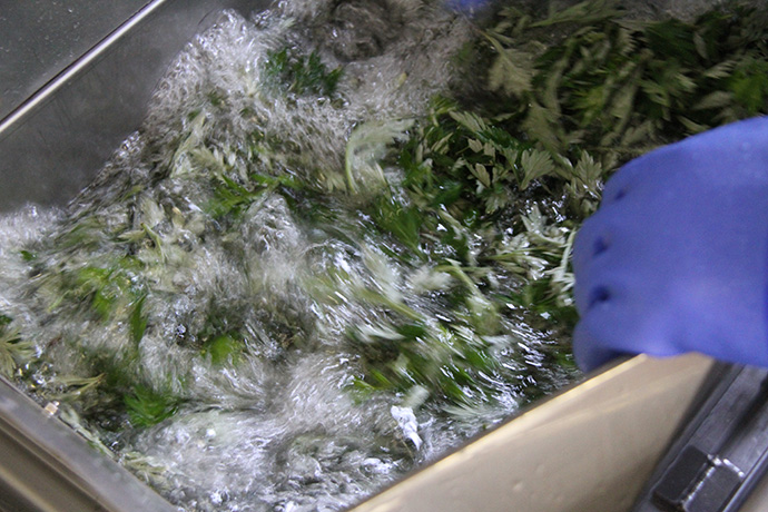 茹であがったよもぎは、もう一度、選別し不純物を取り除きます。