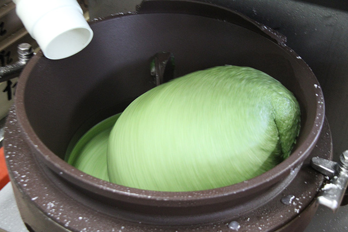 蒸した糯米によもぎを足して、搗いていきます。