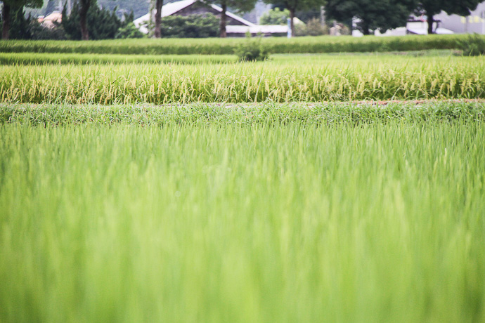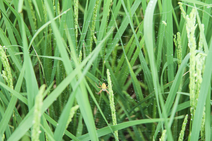 向こうの田のうるち米はもう穂がだいぶ実って頭を垂れつつありますが、こちら側の糯米の穂はまだ小さいです。