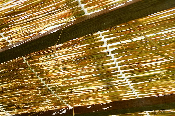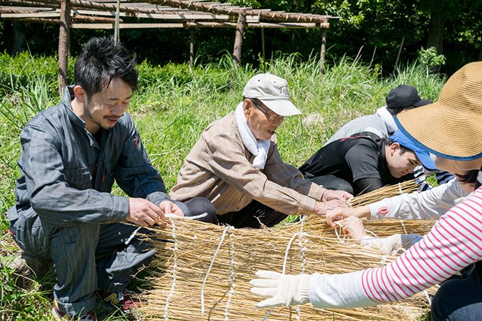 私たちも、こもをヒモでつなぎ、木組みに被せる作業を手伝わせていただくことに。